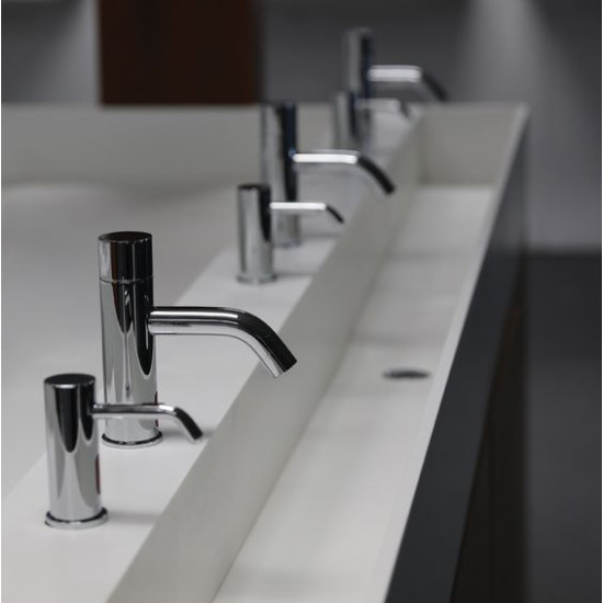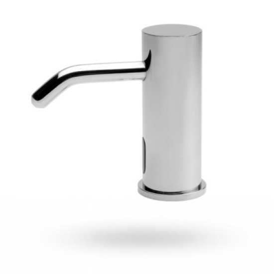 Безконтактний дозатор для мила, що спрацьовує від інфрачервоного датчика, для установки на раковині або стільниці. Покриття дозатора – хромоване, за бажанням замовника можливі інші покриття. При слабкому зарядженні батареї датчик починає блимати. У стандартний комплект поставки входить ємність для мила на 1 літр і пристрій для ємності, що підтримує. Додатково можна замовити подовжувач та довшу трубку, що виходить із дозатора.
