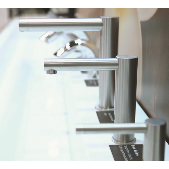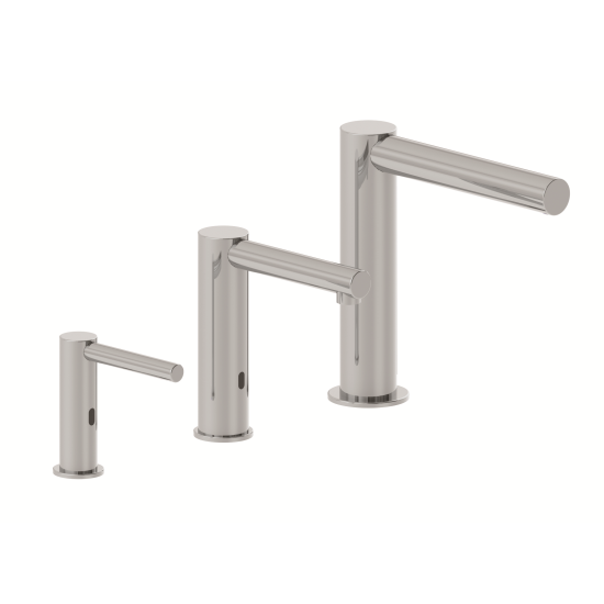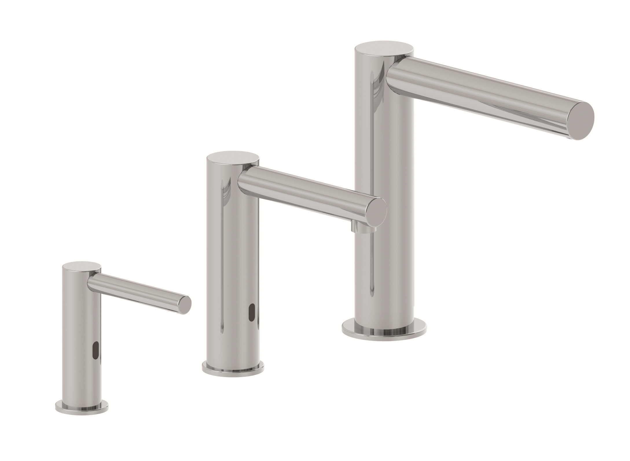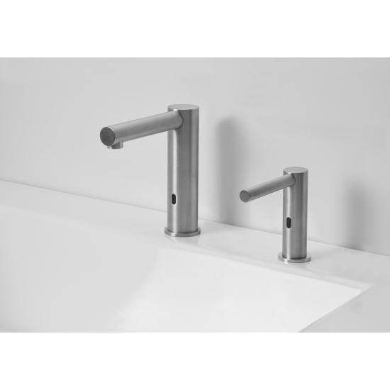 Високошвидкісна сушарка для рук, сенсорні (безконтактні) змішувач та дозатор рідкого мила для монтажу на умивальнику або стільниці. Серії EVER Поставляється з пультом дистанційного керування для налаштування діапазону спрацьовування датчиків, дозування мила.