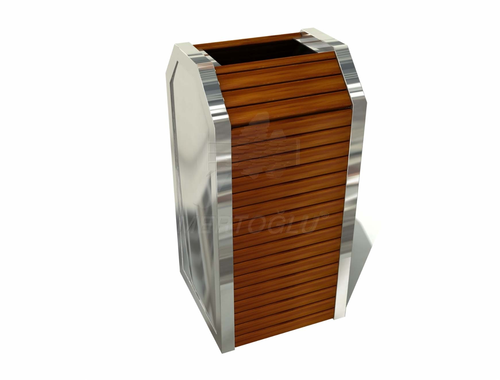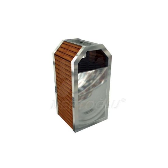 Урна для сміття серії “Ексклюзив” з нержавіючої сталі AISI 304 та дерева-Сосни з просоченням та лаковим покриттям, об'єм урни 35 літрів, встановлюється на підлогу, для застосування всередині приміщення