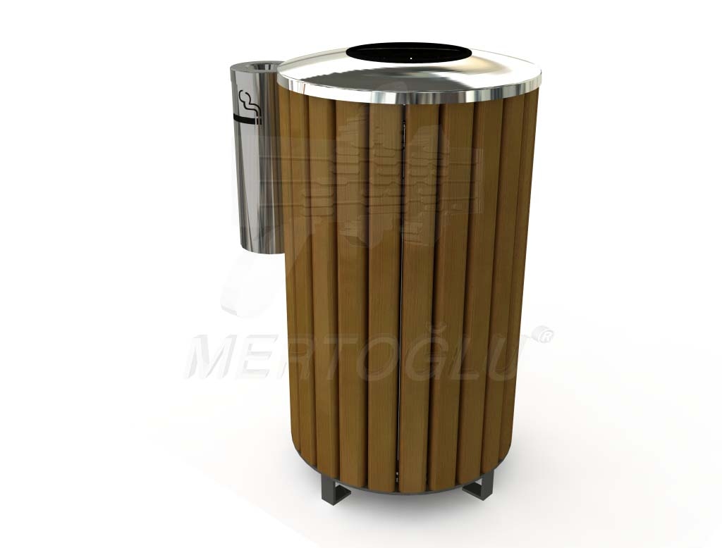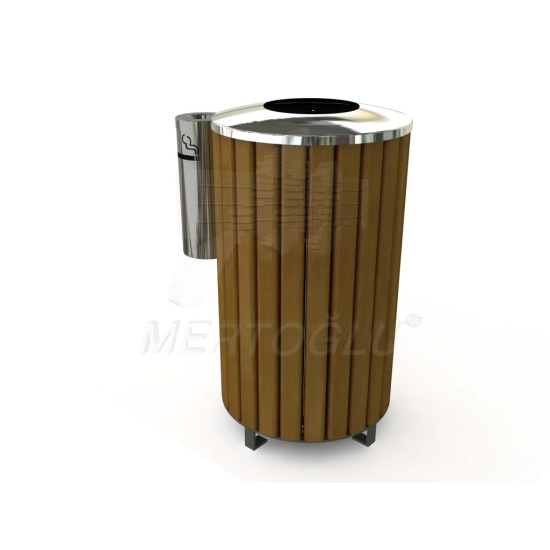 Урна для сміття з попільничкою, каркас і попільничка - нержавіюча сталь AISI 304, дерево - Сосна з просоченням і лаковим покриттям, загальний об'єм 33 літри, встановлюється на підлогу, для застосування на вулиці