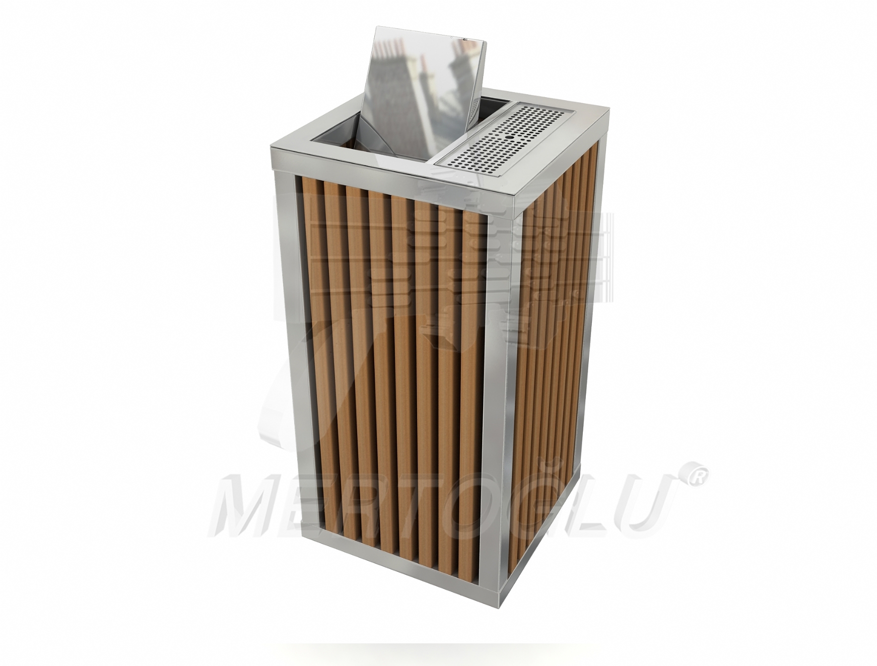Урна для сміття з поворотною кришкою, з нержавіючої сталі,дерево- Сосна з просоченням і лаковим покриттям, загальний об'єм 58 літрів,встановлюється на підлогу, для застосування на вулиці