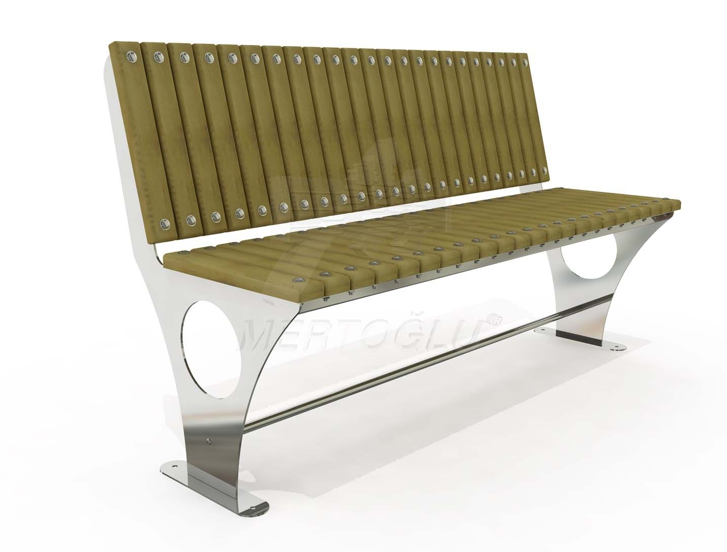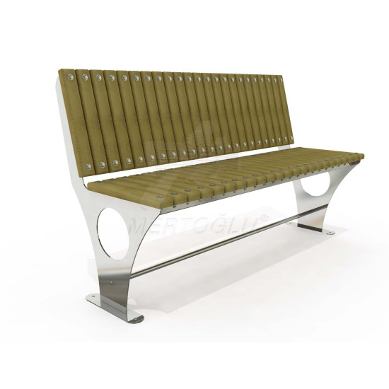 Лавка , каркас - нержавіюча сталь AISI 304, дерево-сосна з просоченням та лаковим покриттям, для застосування всередині та зовні приміщення