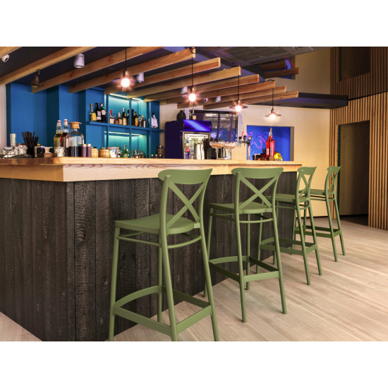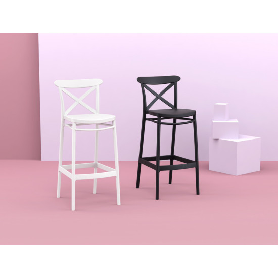 Барний стілець, що штабелюється (висотою 75 см) CROSS виконаний з поліпропілену, армованого скловолокном, отриманим з використанням новітнього покоління технологій формування пластмас під тиском. Єдина форма без стиків та з'єднань