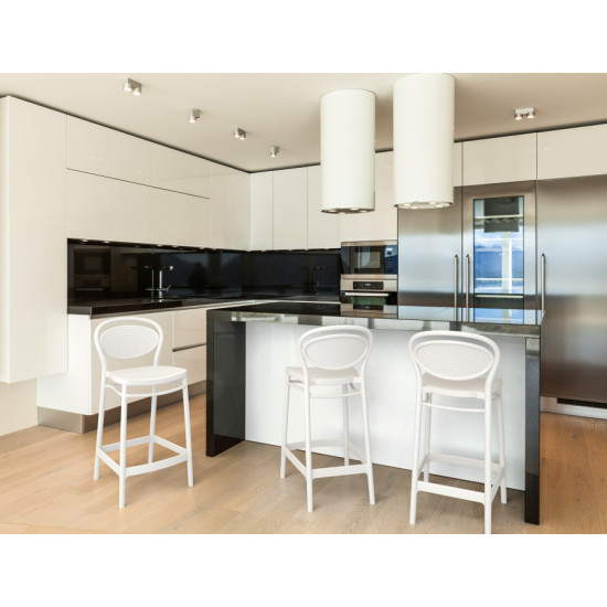 Барний стілець, що штабелюється (висотою 65 см) MARCEL виконаний з поліпропілену, армованого скловолокном, отриманим з використанням новітнього покоління технологій формування пластмас під тиском. Єдина форма без стиків та з'єднань