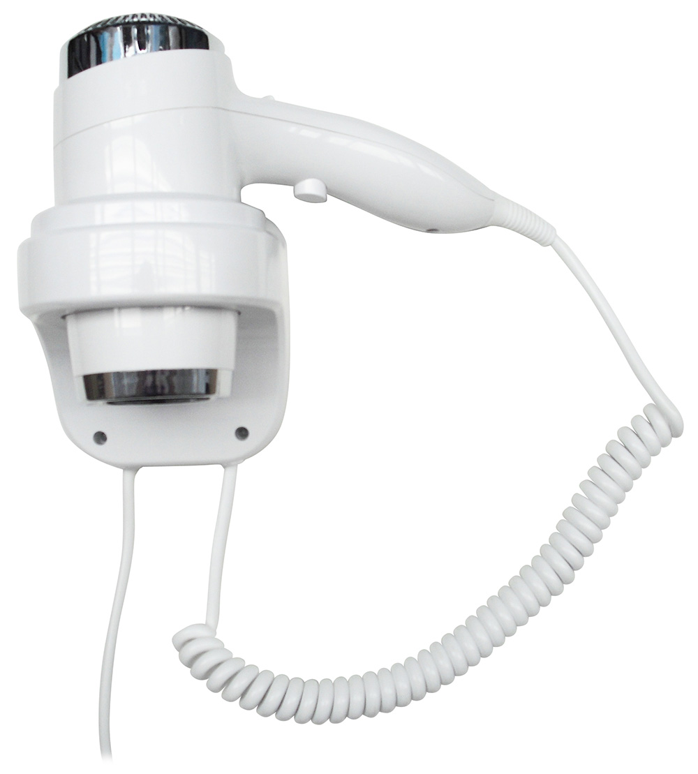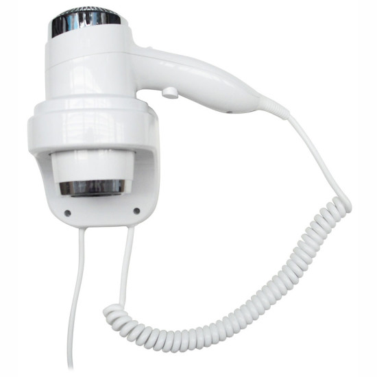 Фен для волосся настінний, виконаний з удароміцного АВС пластику, оснащений кнопкою регулювання потужності та двома режимами швидкості, потужність споживання максимальна 2200 W-мінімальна 1800 W , швидкість потоку повітря 58 км\год. Апарат чудово підійде для використання у готелях категорії 3,4 або навіть 5 зірок.