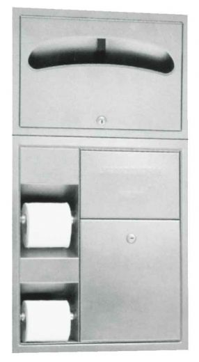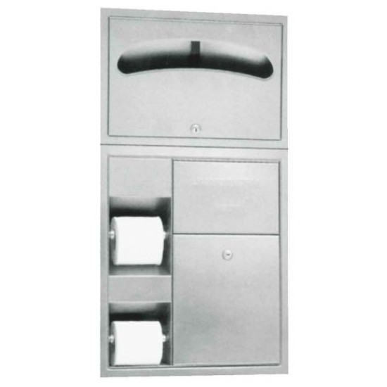 Вбудований в стіну компактний гарнітур, в виріб входить: тримач туалетного паперу (2 стандартні рулони) тримач накладок на унітаз (500 листів), кошик урна для сміття з кришкою (7,5 літрів), що самозакривається, корпус-нержавіюча сталь AI.