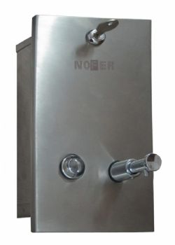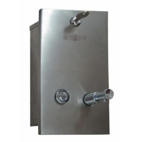 Дозатор рідкого мила, що вбудовується в стіну, об'єм 1200 мл, усі конструкція та всі компоненти виконані з нержавіючої сталі AISI 304, призначений для місць з великою прохідністю. Горизонтальні двері із замком. Вікна для контролю рівня мила. Підходить для наповнення рідким милом різної консистенції