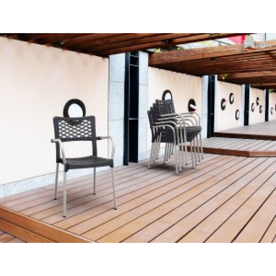Штабельоване крісло BELLA виконане з поліпропілену, армованого скловолокном, отриманим з використанням новітнього покоління технологій формування пластмас під тиском з полікарбонату, що переробляється, і анодованого алюмінію, діаметром 25 мм.